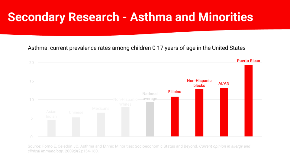 To complement our exploratory and primary research, we looked into secondary sources to find populations with the most need for services. We found asthma severity to be higher in minority populations, such as Puerto Rican, American-Indian/Alaskan Native, African-American, and Filipino populations.