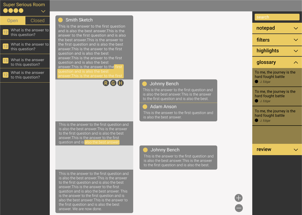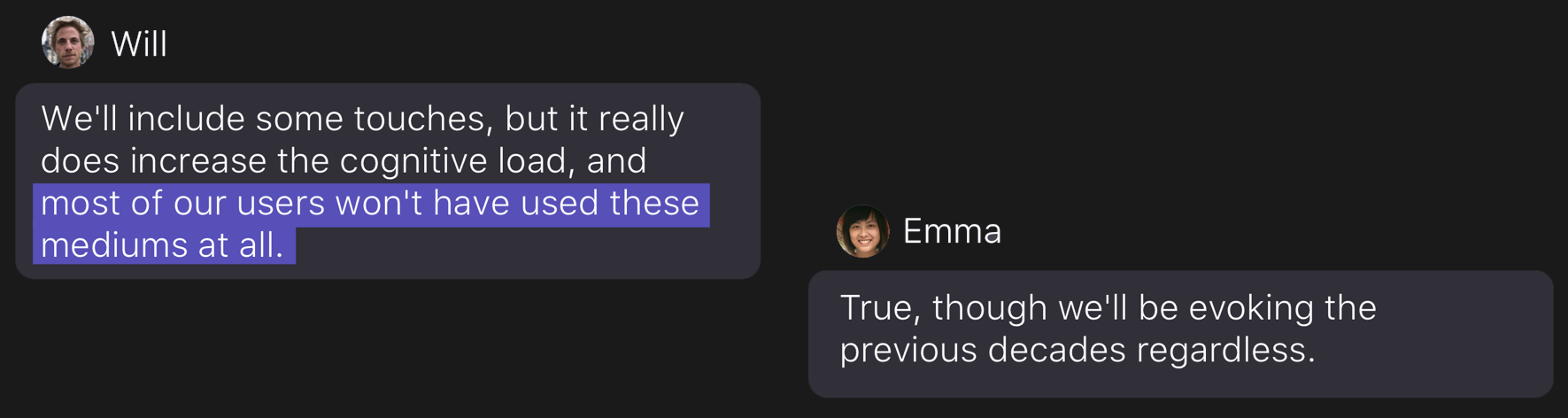 A classical highlight identified by a purple background is used to bring attention to a piece of content. Once highlighted, a user can decide whether to respond to the highlighted piece of content. If a response-highlight is in the middle of a comment, the lower part of that comment will displace down the height of the response, with a low-opacity area filling in between the now-displaced halves, communicating that they are part of the same comment.