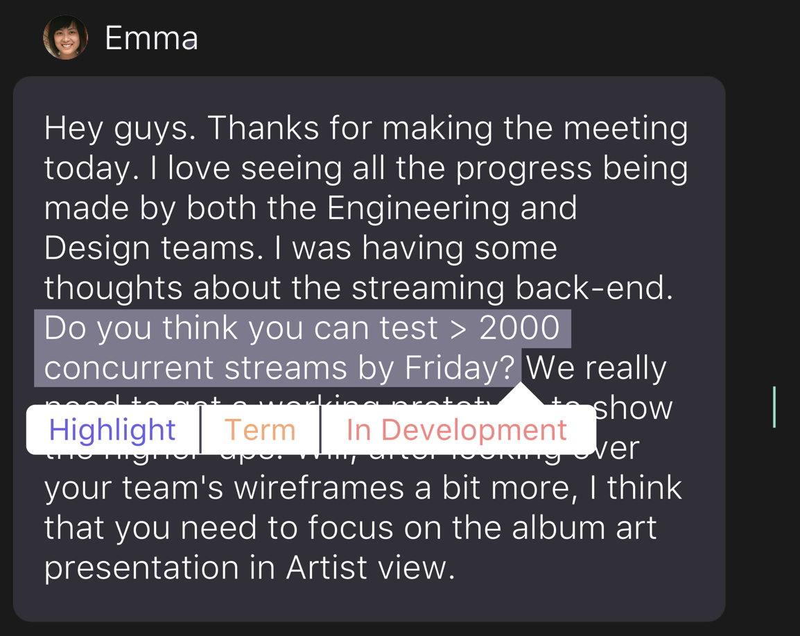Replies on Converge are powered by highlights. Converge allows three different types of highlighting, and their differing types of coloring allows them to be easily superimposed. Once a section of text has been selected, a popover appears allowing the user to tag the selection as a classical highlight, term, or in development.