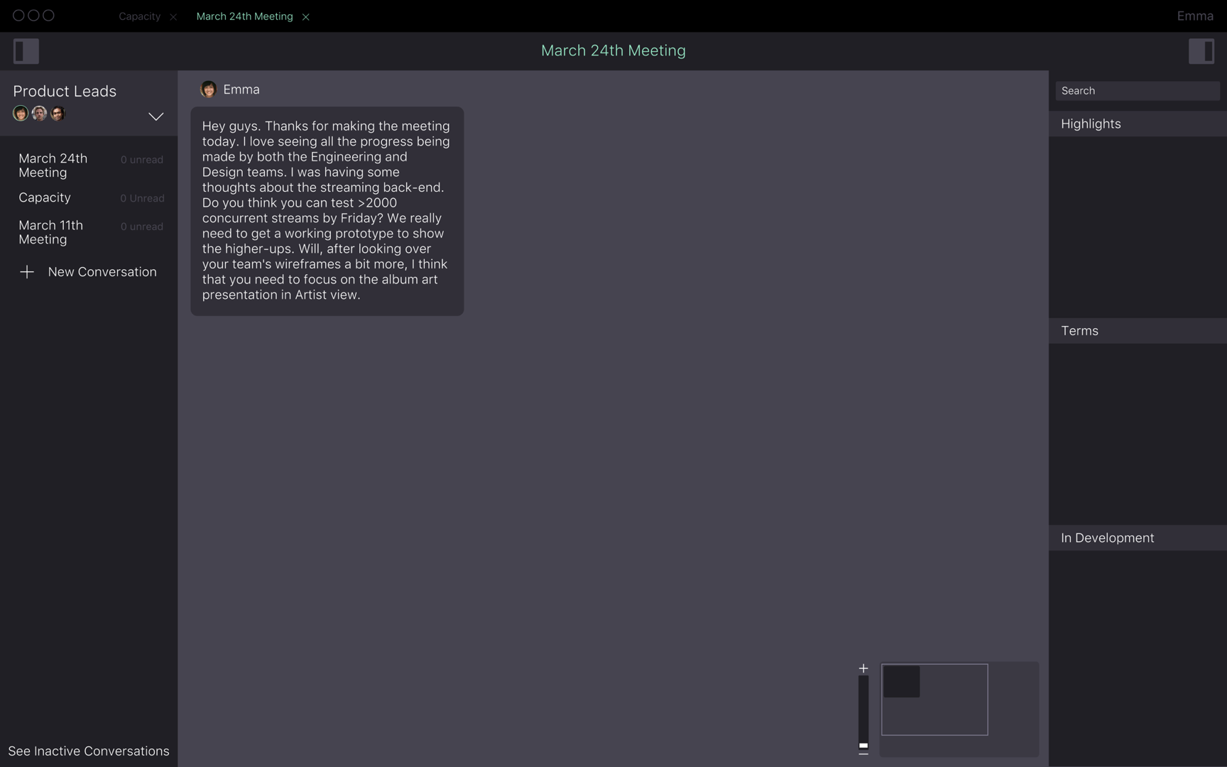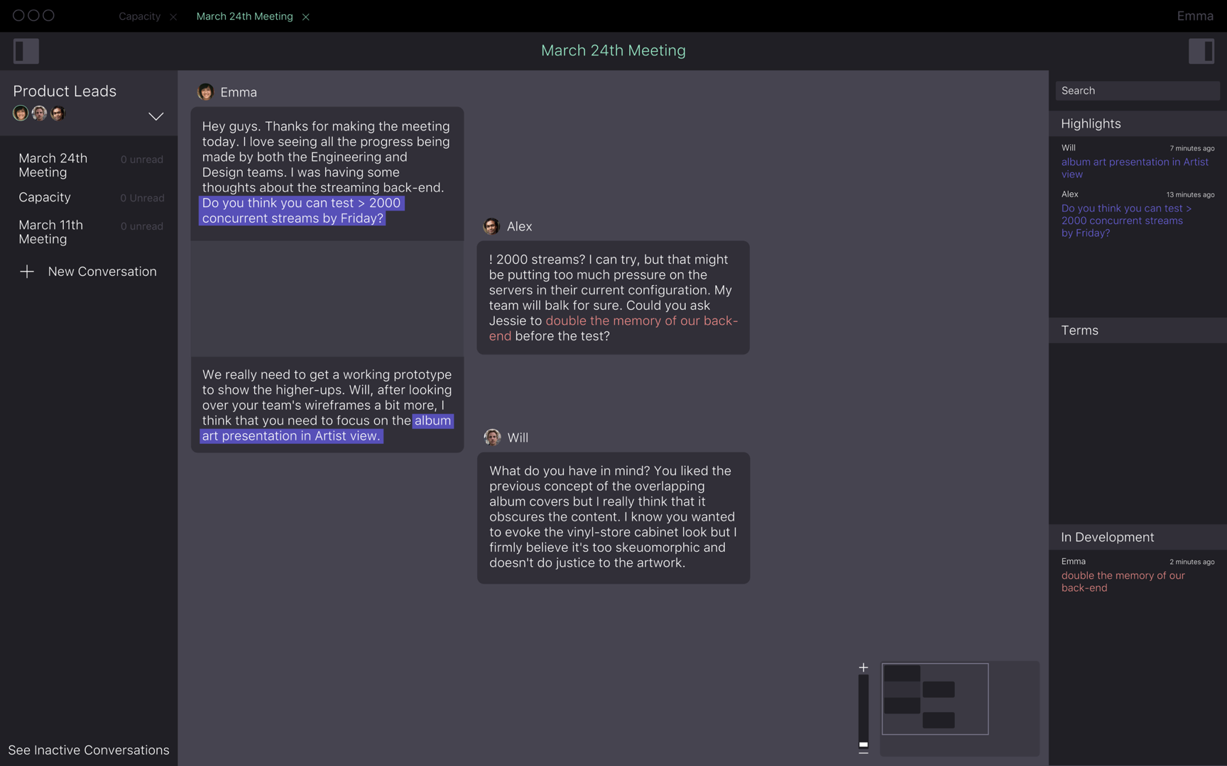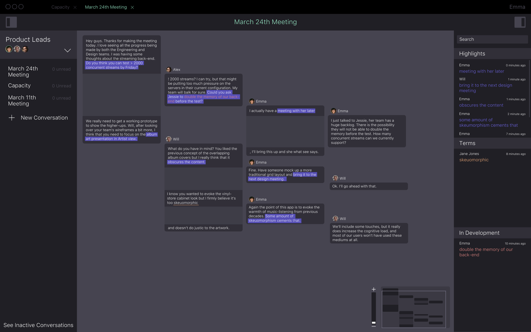 Users have the ability to search the conversation, with results populating in the highlights bar. Thus search results that match previously identified terms appear within the terms subsection - likewise with "in development". The top highlights section in the right-hand panel displays all matching text, highlighted or not; Non-highlighted matching strings are displayed as white while previously highlighted strings appear their purple color.