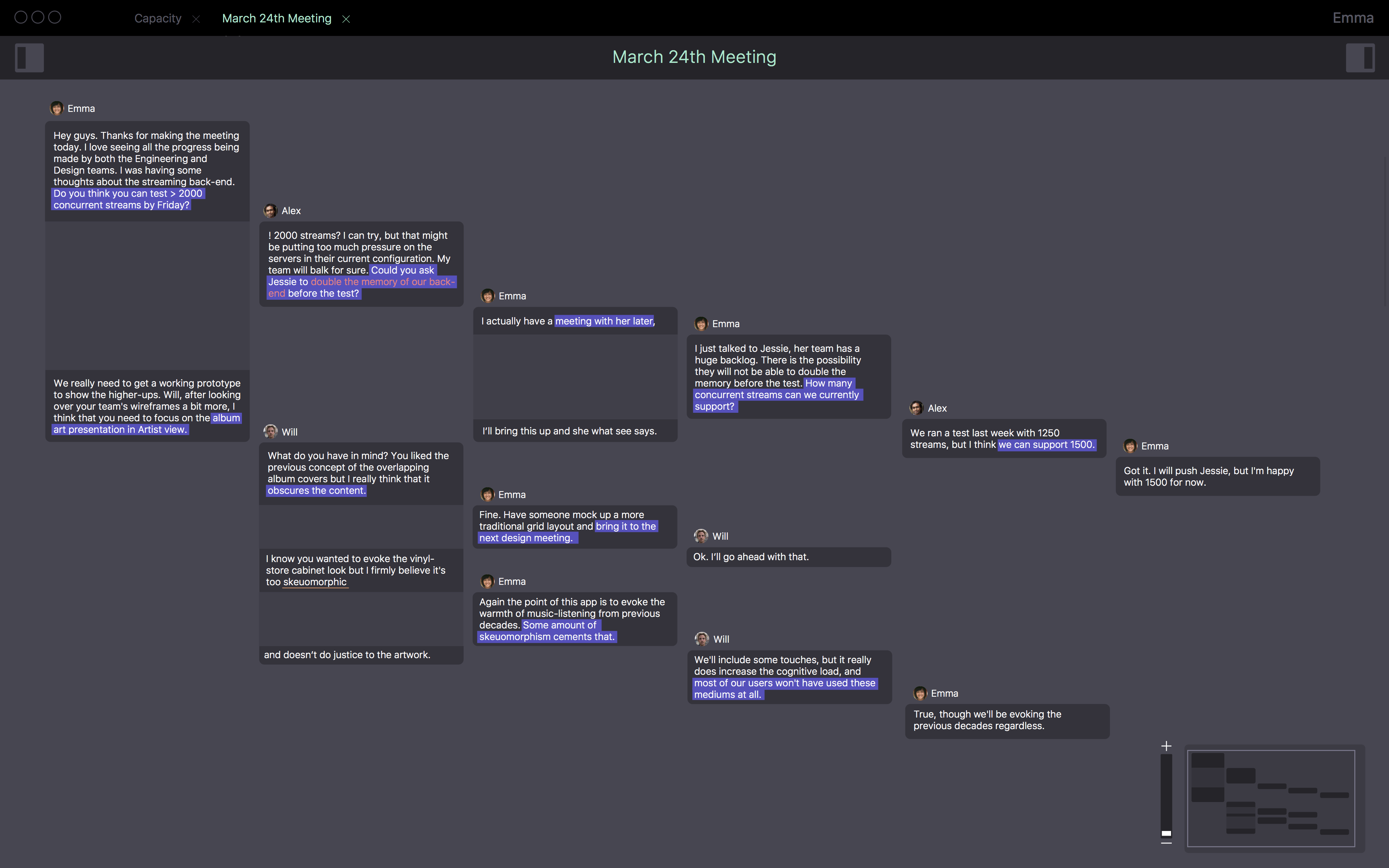 At the most zoomed-out level, the conversation enters a compacted mode where only highlighted text is shown. As the highlights have been collaboratively identified as the most important parts of a conversation, showing only highlights effectively filters out the less-pertinent sentences, allowing even quicker surveyability of the flow of the conversation.