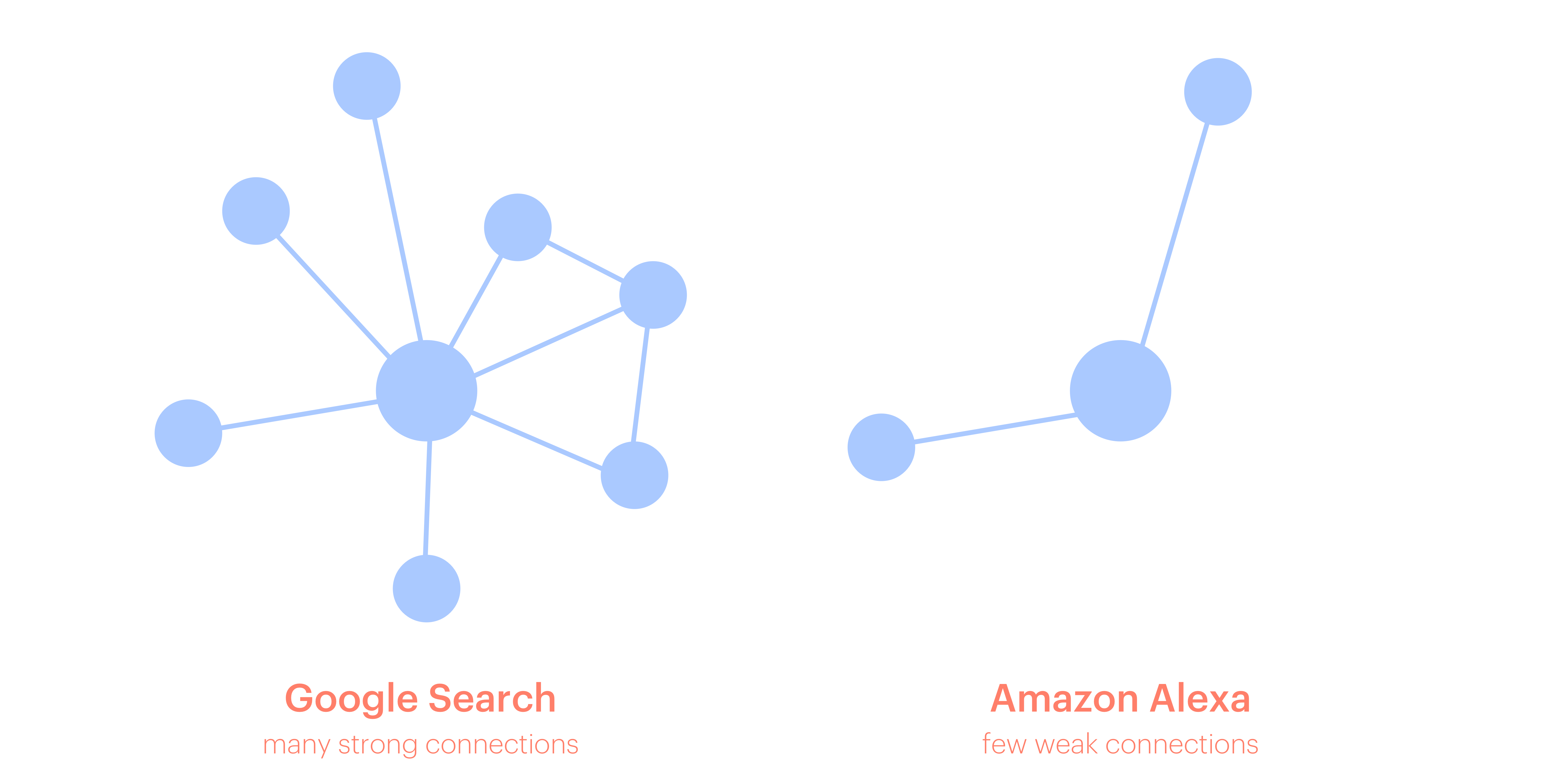 - Participants saw Google as having many strong connections. They also saw it as a source that could easily link them to other sources. For instance, one Google web search could link that participant to thousands of other informational sources, all clearly credited. In contrast, Alexa had a few weak connections and seen as a single entity. Participants were unaware of the information's origin and assumed that Alexa did not have the links to the informational sources that Google has.