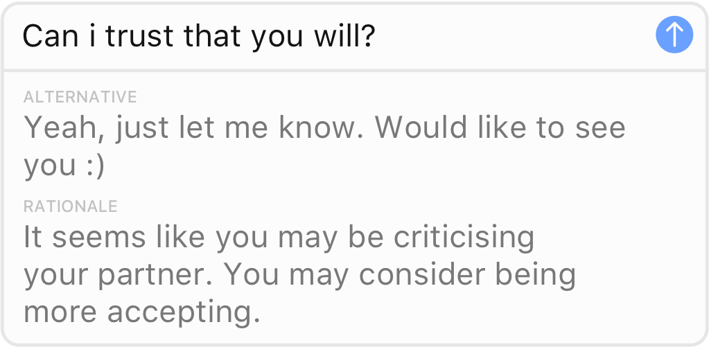 An iteration of Intimately that could address this issue may provide different amounts of guidance based on the amount of time a user contemplates the message in question. For example, a user might open Intimately and see a message from their partner. If that user immediately responds to that message, Intimately would remain in the background, passively analyzing the conversation. If instead, Intimately finds that the partner is deliberating over the message (i.e., continuously revising the message, typing something and looking at the message for 30 seconds before typing something else), Intimately would take an active approach. But instead of providing an alternative it would provide counsel related to that message and the larger context of that conversation.