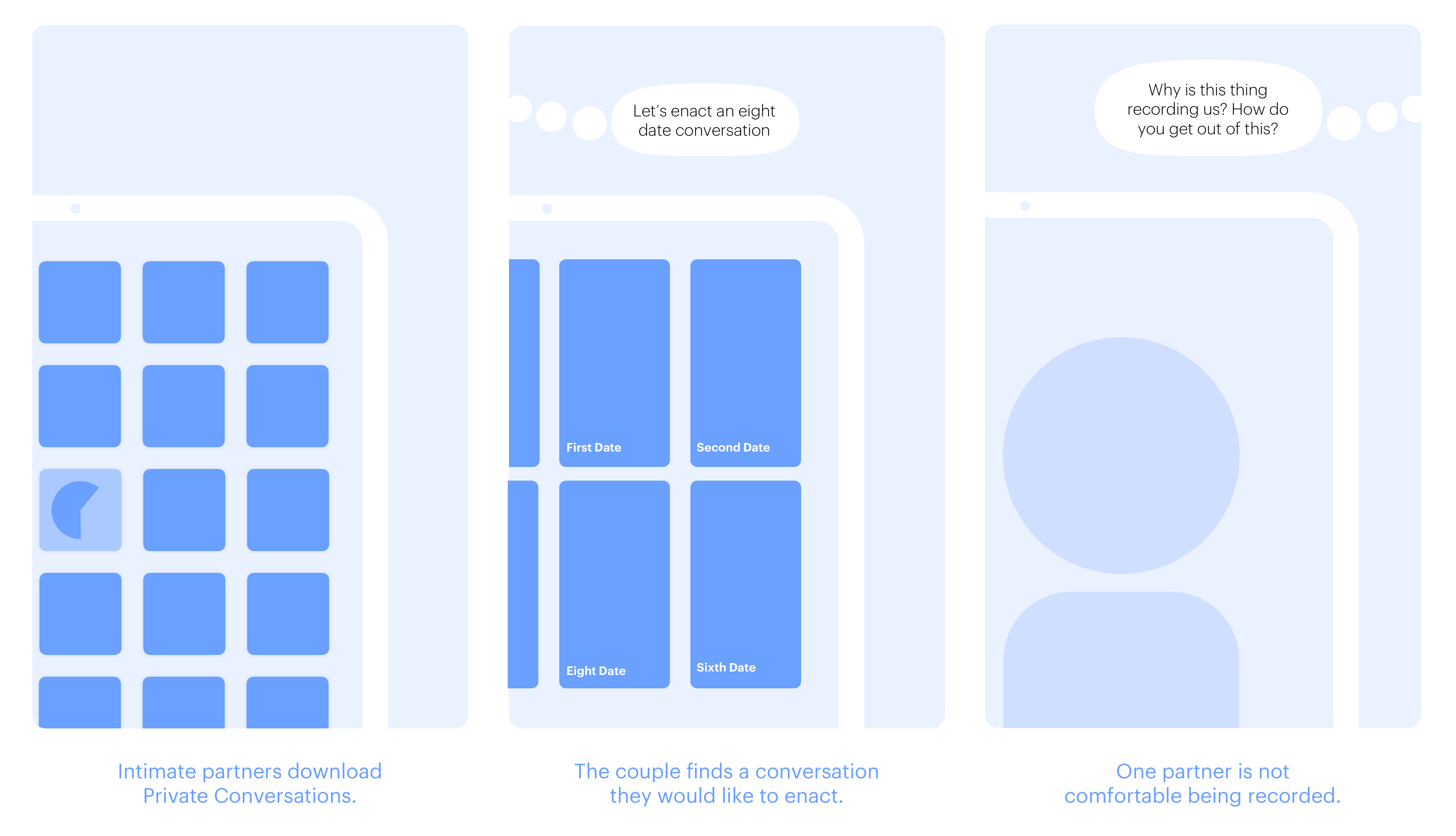 Themes found in these storyboards include the need for diverse representations of intimate relationships and channels that enable a couple to engage. A consideration of the experiences that Private Conversations depicts is needed to ensure that it functions well for a diversity of couples, and serves couples participating in unconventional practices. Further attention must be paid to the various mediums an intimate couple will use to interact and converse.