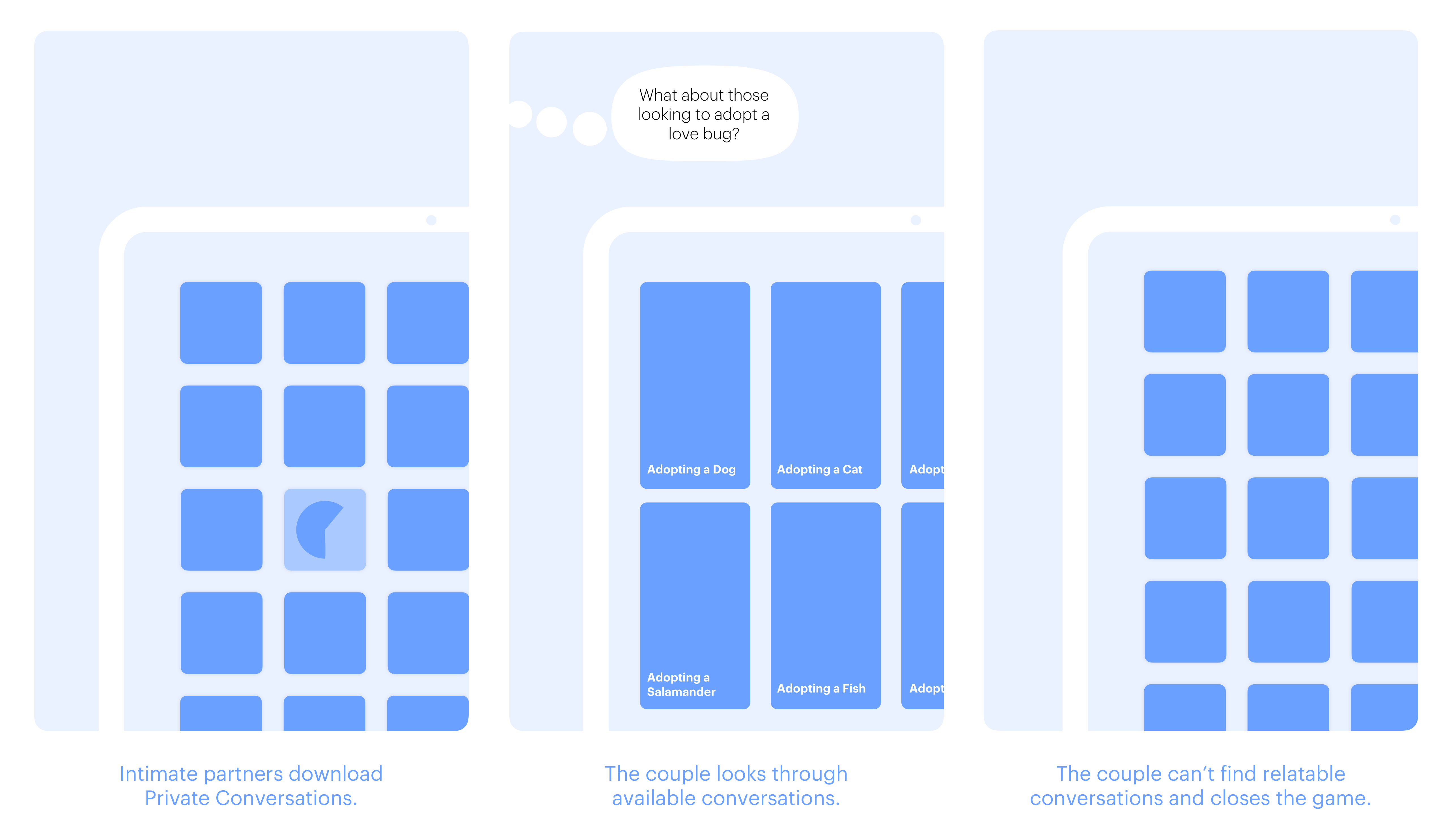 Insight into user's sentiment of Private Conversations was much more positive than negative. Research participants found the intervention valuable because of the variety of conversations it enabled them to enact and the insight it could provide. At the same time, some participants did not believe that Private Conversations would create a "safe space" for a couple. Others saw the game as "empowering" to some, in that it gave a user the tools to navigate tough conversations with their partner. Other insights include:
