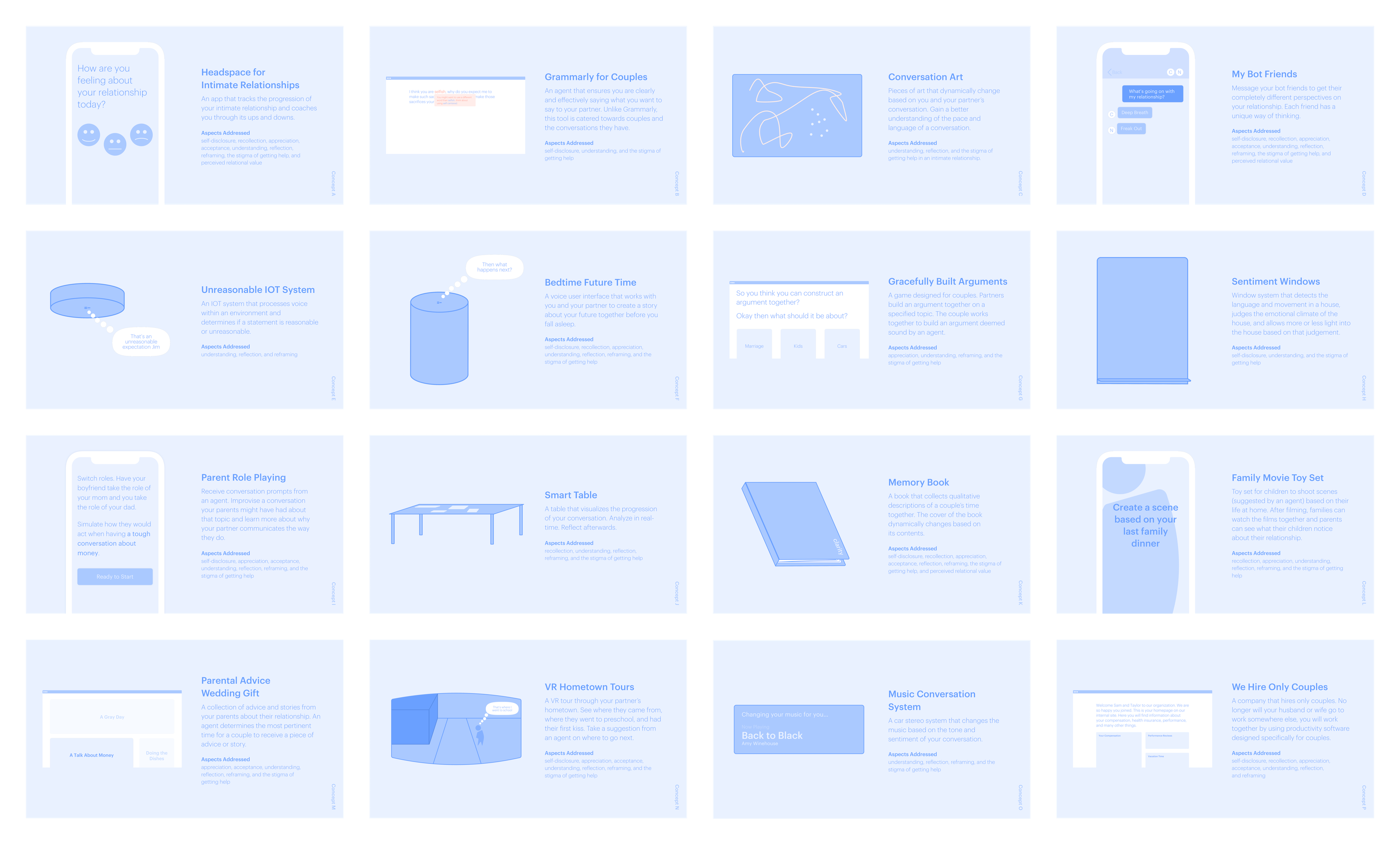 A large portion of the generative phase was dedicated to conducting investigations through prototypes. Explore each of the prototyped concepts below to see how they could enhance an intimate partners' capacity for expression and understanding.
