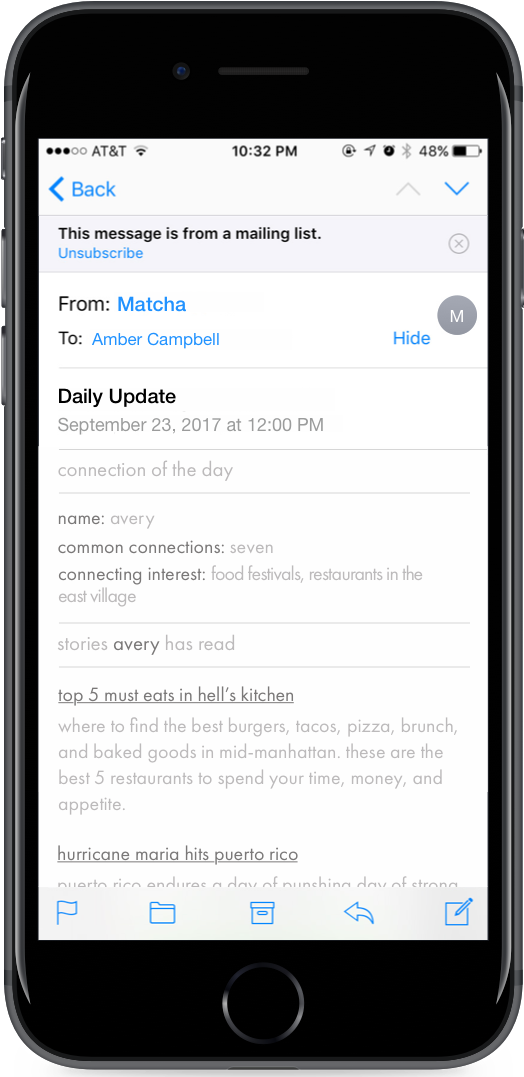 MediaBridge came out of one of our earlier concepts, NewsPal, a daily email containing links to articles another user (who has engaged with content similar to you) visited over the course of the day. Ideally, NewsPal would connect individuals with similar interests but very different backgrounds. Allowing a grandfather from Nevada to see the news read by a teenager in Alabama and vice versa.