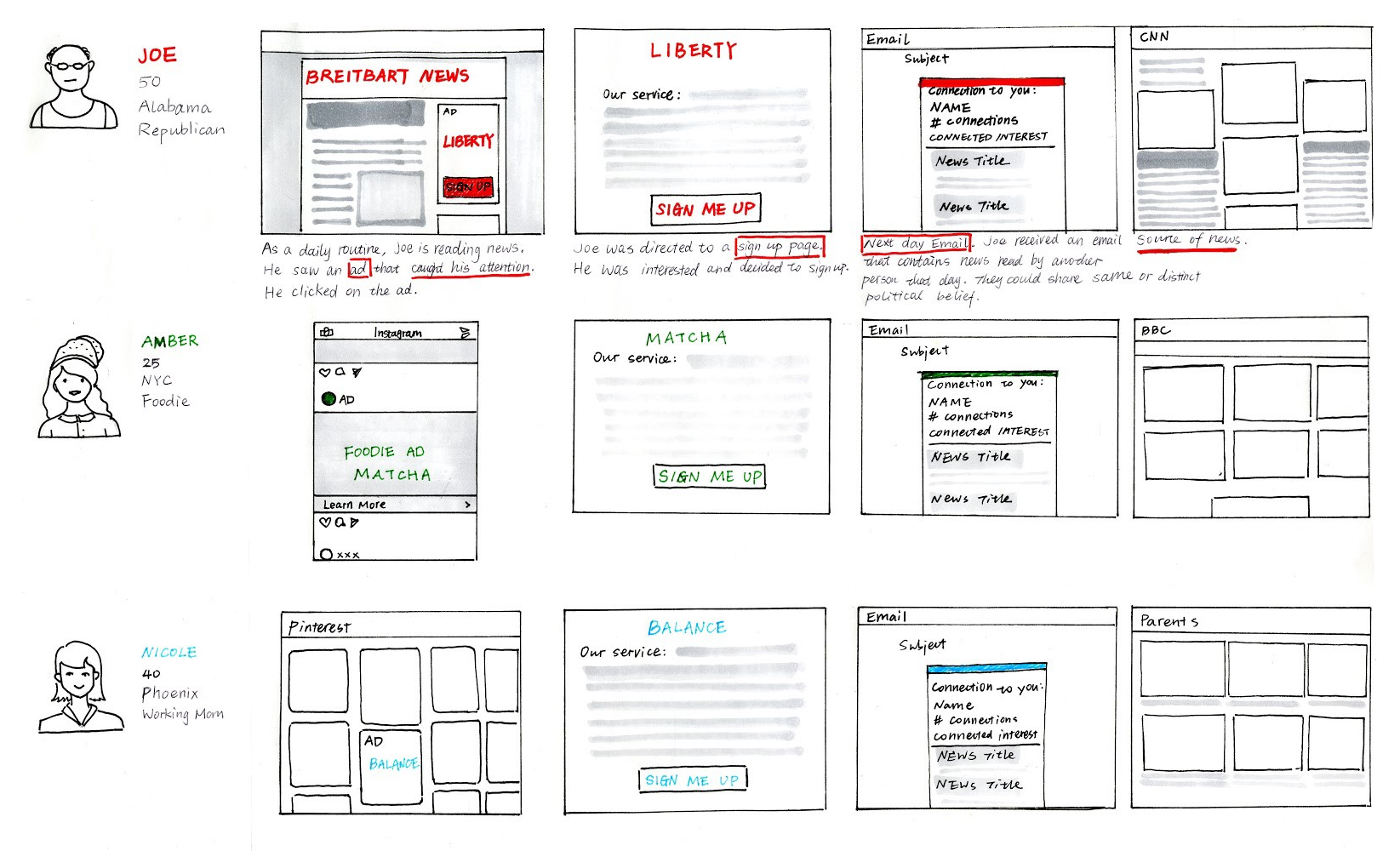 MediaBridge doesn't only target conservatives. Take for instance, Amber Campbell a 25-year-old resident of New York City interested in food trends and restaurants in NYC. She rarely reads the news and MediaBridge targets her through Instagram ads, asking if she wants to view what other "foodies" are reading. She signs up for MediaBridge and receives daily emails. One day, she is connected with her boyfriend's cousin who shares her interest in food festivals and Hell's Kitchen. Through daily emails, MediaBridge encourages Amber to read more worldly stories in addition to the stories she currently reads. After a few weeks, MediaBridge includes a progress update. The update shows the type of stories she is viewing and includes encouraging messages to either keep up the good work or view a wider range of news. These messages also draw attention to filter bubbles and bias found in media.
