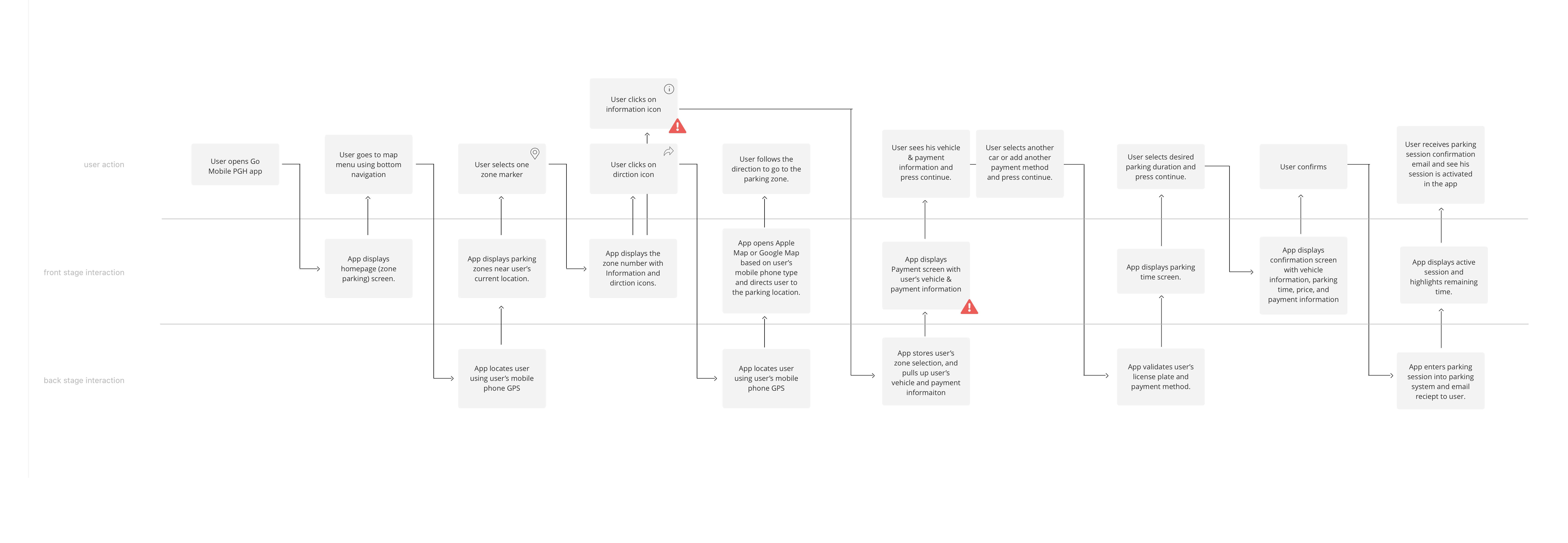 This flow depicts how a user finds available parking spots prior to their departure using the proposed Go Mobile PGH application and parks in the selected parking zone.
