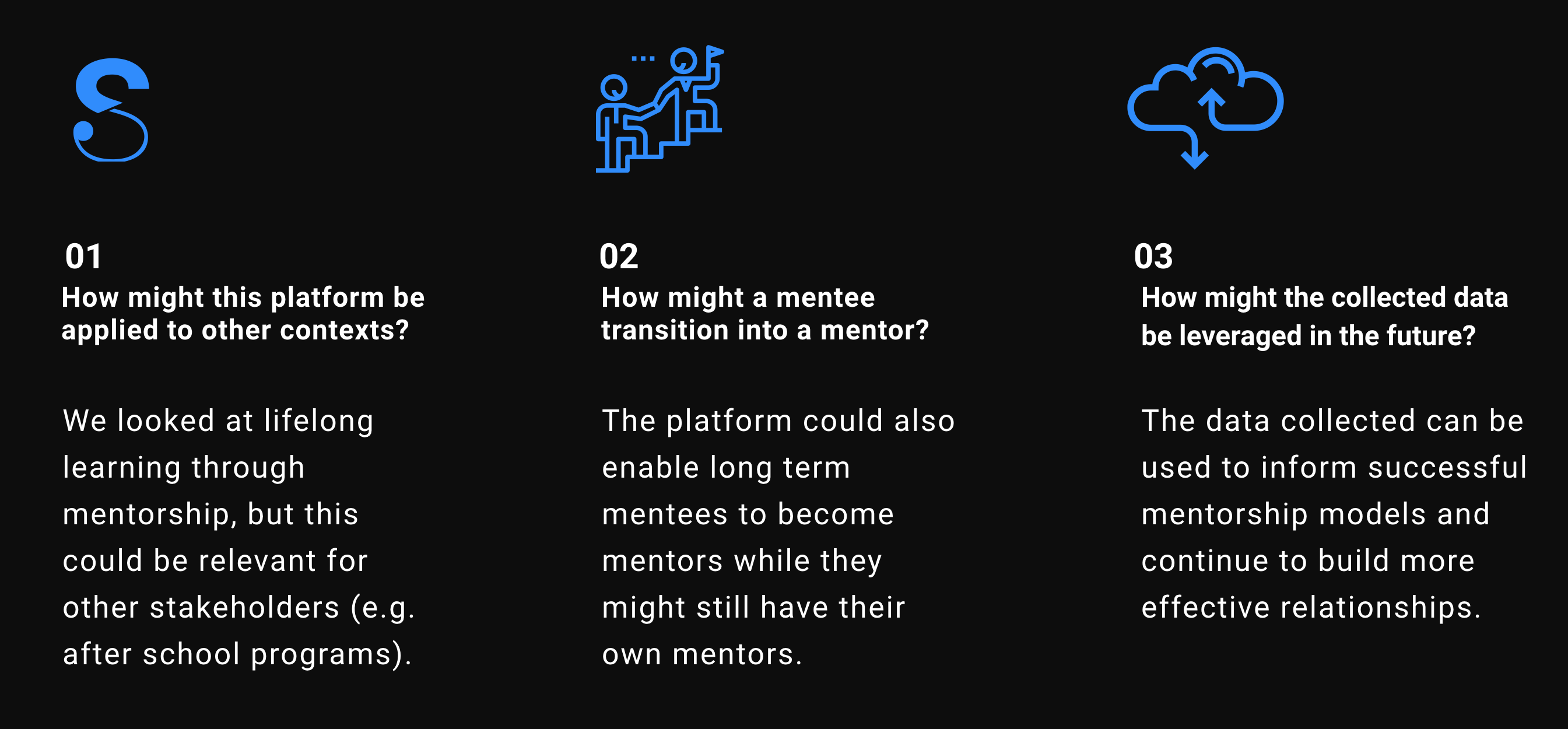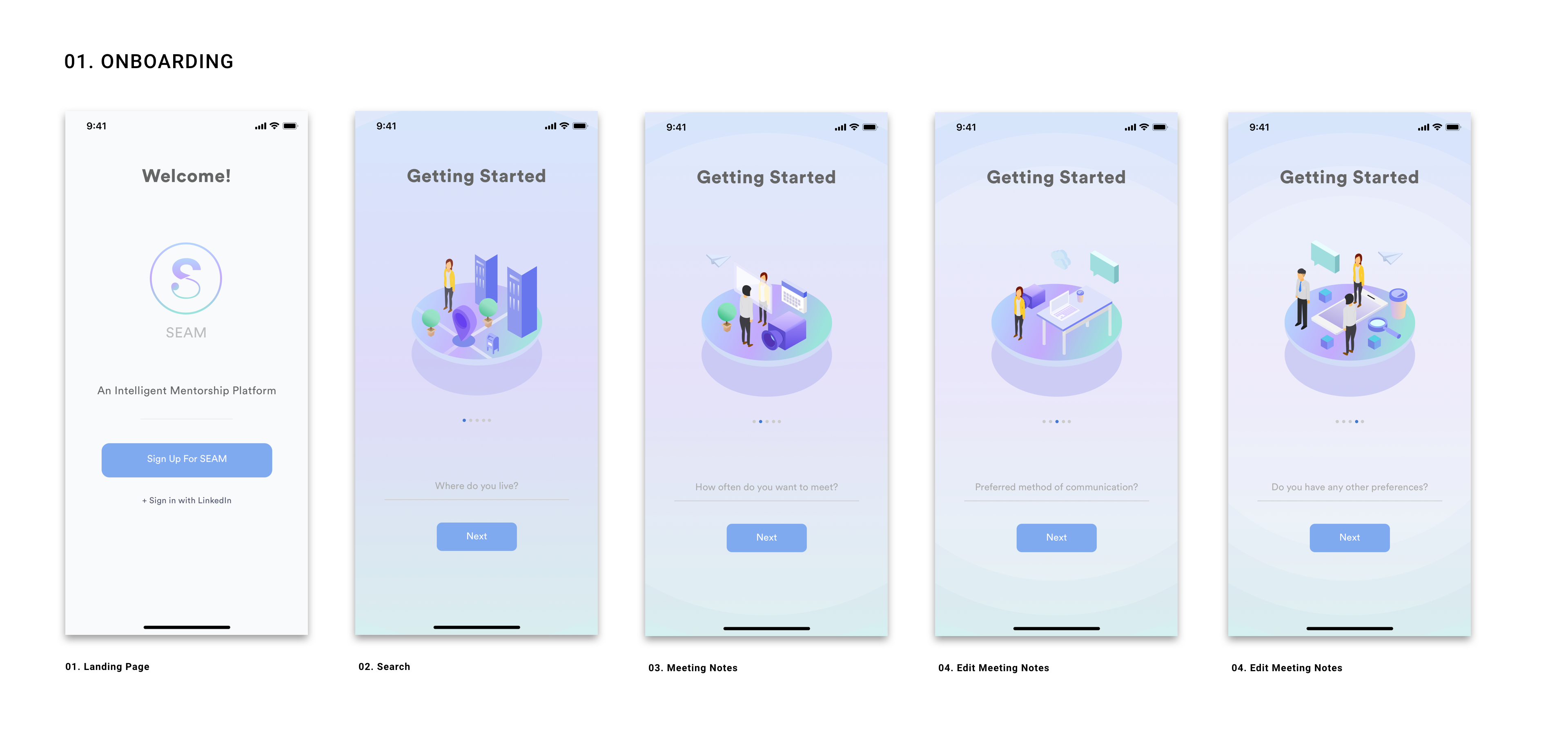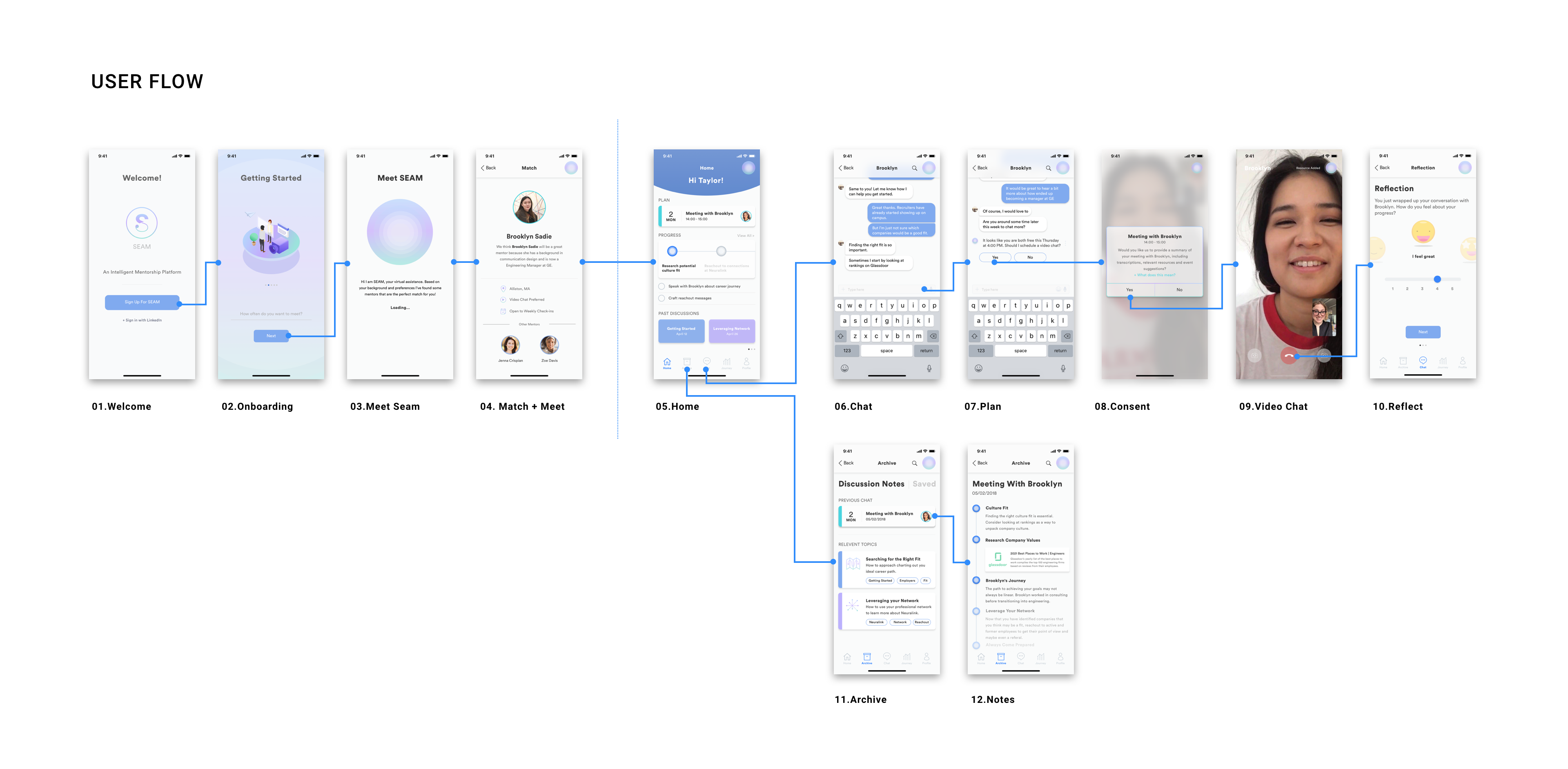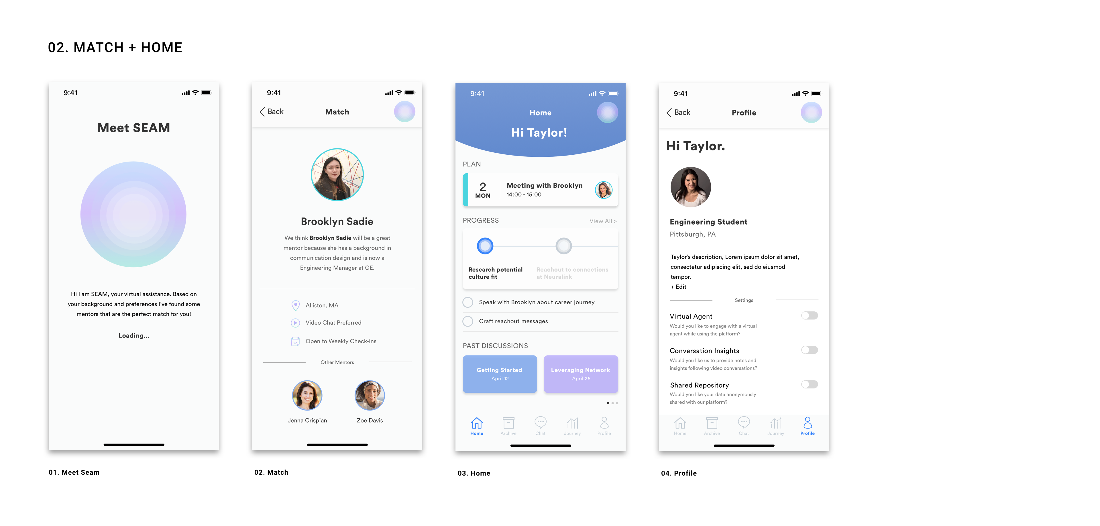 With these design principles in hand, my team designed Seam, an intelligent mentorship platform that connects students with mentors to bridge the gap between academia and industry, facilitates learning, and encourages lasting human to human relationships.