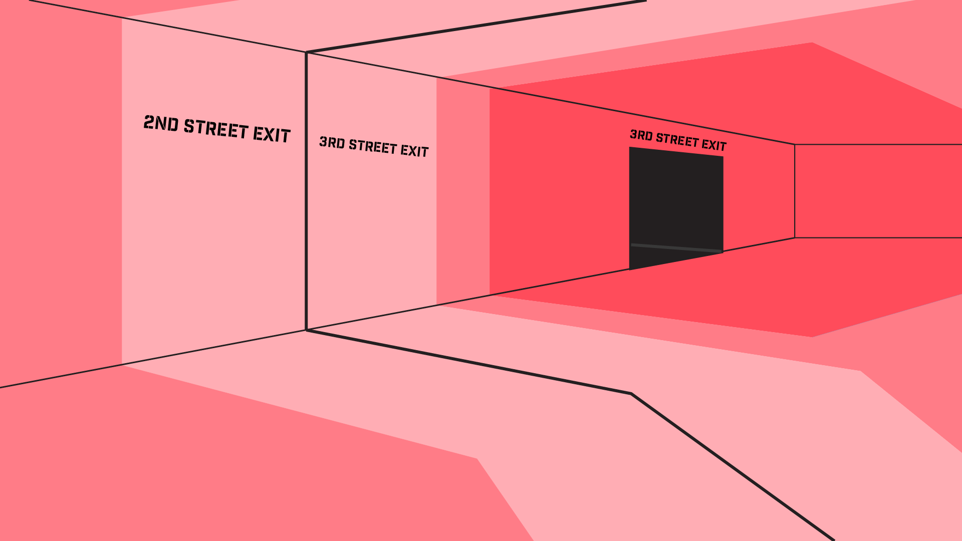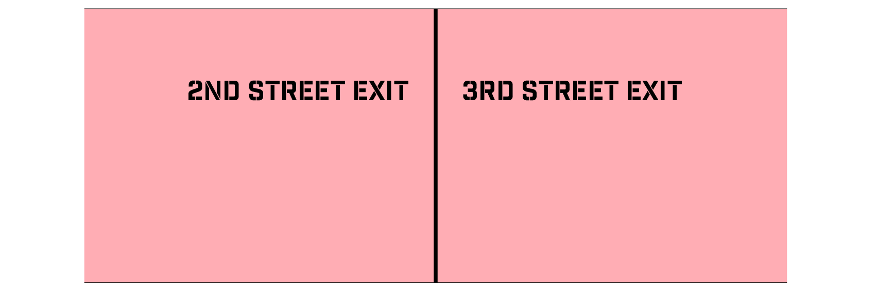 Additional elements were created to align with the diagrams including a key (helping people understand the system, more saturated color = closer parking spot, less saturated color = further parking spot), exit lines painted on the floor (the Voronoi Parking garage does not utilize any obtrusive signage that is not part of the existing environment), and directional signage.