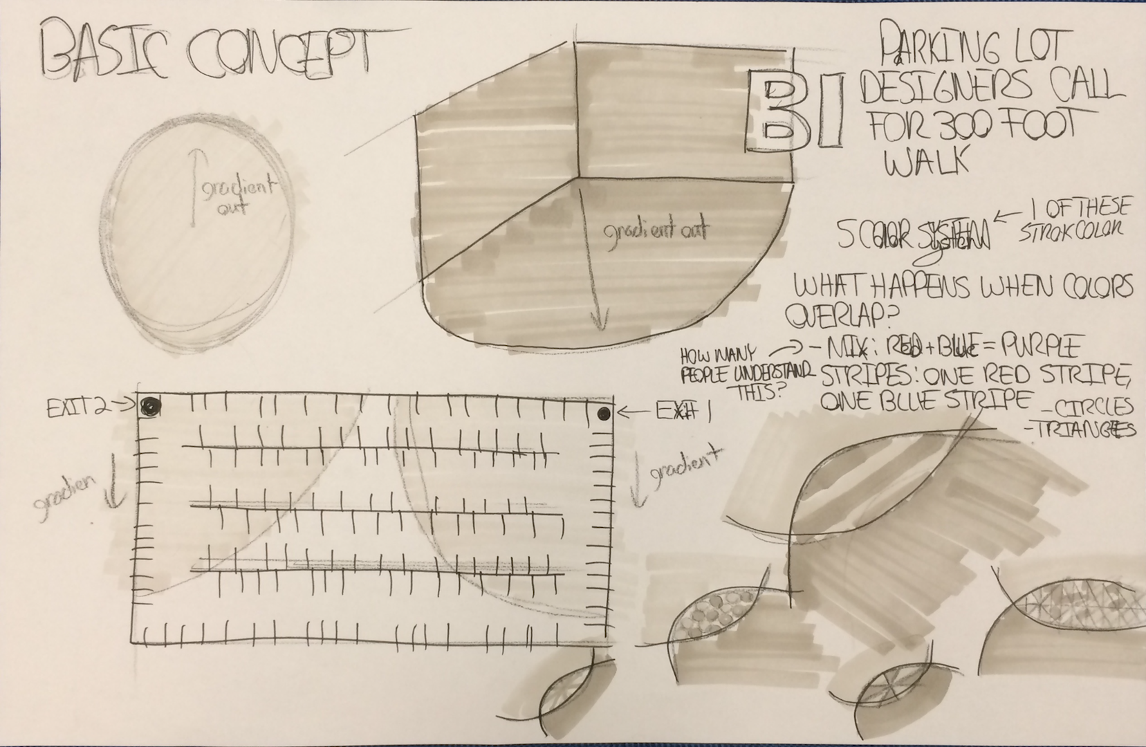With the restrictions I had created for myself, I went back to sketching and developing potential solutions. One of these concepts that I was particularly excited about utilized painted “radar circles” to visualize the best parking spots.